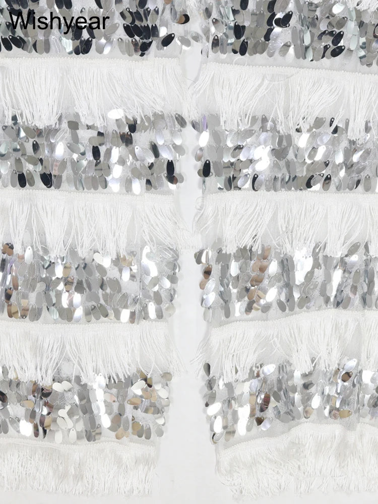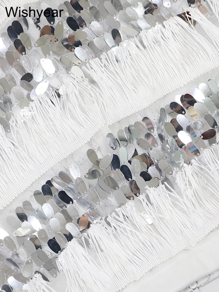 New Luxury Sequin Tassel Women Sleeveless Strapless Crop Tops and Wide Leg Pants Two 2 Piece Sexy Club Birthday Matching Sets